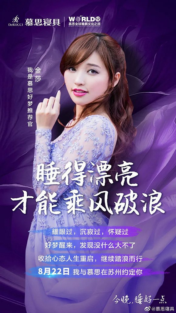 8月10日,慕思寝具宣布金莎成为好梦推荐官。