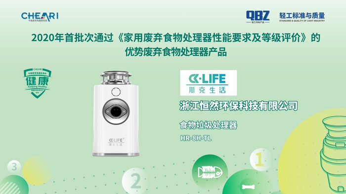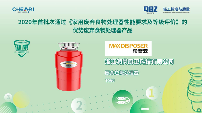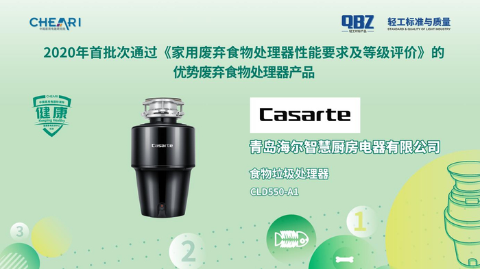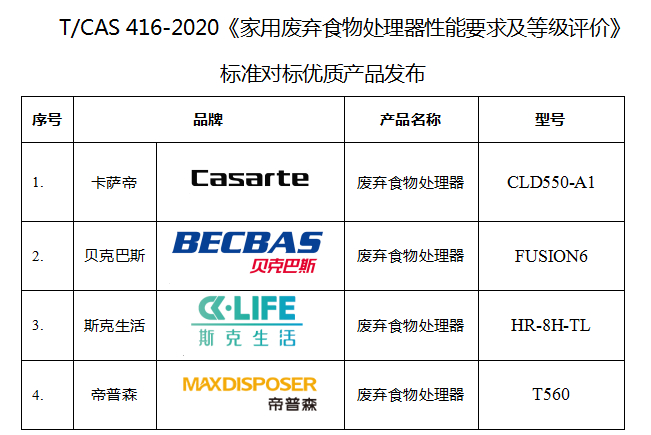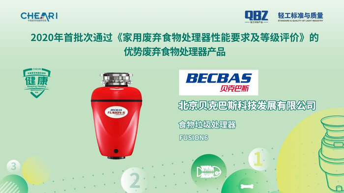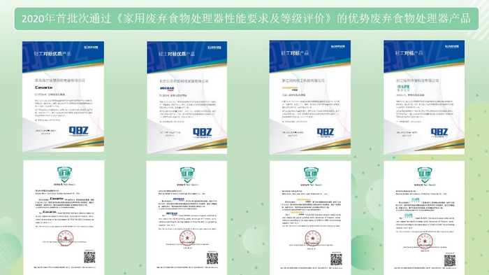 会上发布了2020年首批次通过《家用废弃食物处理器性能要求及等级评价》的优势废弃食物处理器产品:卡萨帝CLD550-A1型食物垃圾处理器、贝克巴斯FUSION6型食物垃圾处理器、斯克生活HR-8H-TL型食物垃圾处理器、帝普森T560型厨余垃圾处理器。