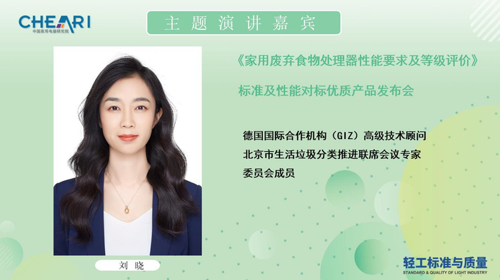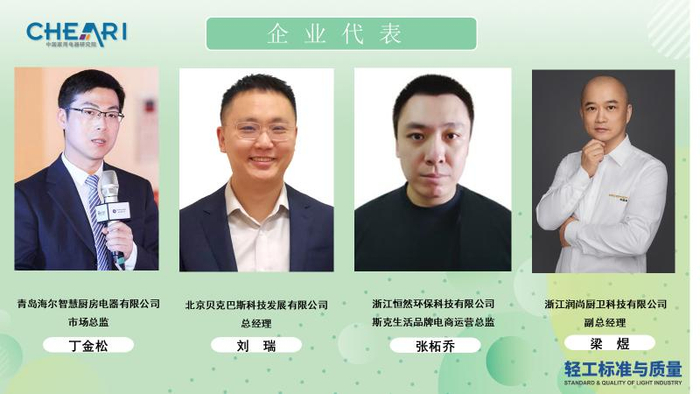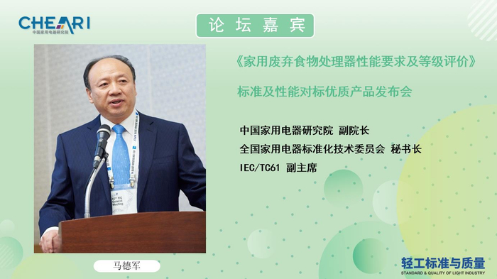 中国家用电器研究院副院长、全国家用电器标准化技术委员会秘书长、IEC/TC61副主席马德军,中国家用电器检测所副所长、健康家电检测中心部长张晓,德国国际合作机构(GIZ)高级技术顾问、北京市生活垃圾分类推进联席会议专家委员会成员刘晓,奥维云网厨卫事业部研究总监赵志伟,中国家用电器检测所健康家电检测中心工程师苏进财,以及海尔智慧厨房电器、贝克巴斯、恒然环保、润尚厨卫等企业的产品负责人,和多家媒体代表参加本次会议。会议由《轻工标准与质量》执行主编孙鹏主持。