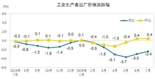 国家统计8月公布的数据显示,2020年7月份,全国工业生产者出厂价格(PPI)同比下降2.4%,环比上涨0.4%.