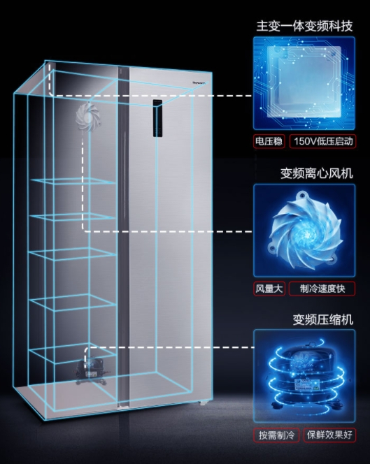 创维作为深受大家喜爱的老牌实力国产电器品牌,其自身技术过硬且创新十足,为生产高质量家电提供了最关键保障。创维冰箱采用主变一体变频科技,内部安装全直流变频压缩机以及风量大、制冷速度快的变频离风机,真正达到了质量与技术双一流水准。相比较于其他冰箱,全直流变频压缩机寿命要高出8-10年,其次其运行过程中产生的噪音也要远远低于交流变频压缩机。而变频离心风机更是具有静音、节能、大风量的优点。有这两个强劲的内部结构做保障,在日常生活中,可以根据使用者需求按需制冷,同时在模式变换的时候能够维持冰箱内温度,避免因温度波动过大导致食物腐败、保质期缩短等,让使用者轻松拥有健康生活。