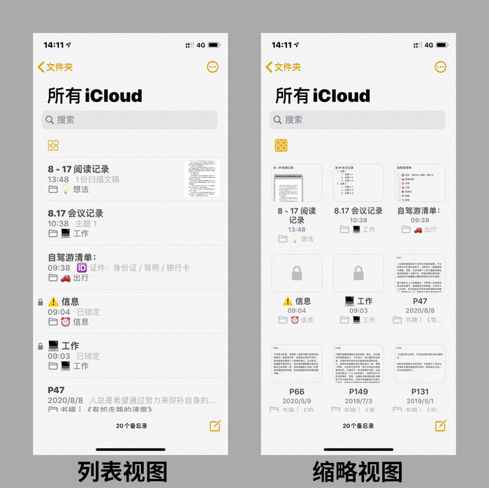 苹果在 iOS/iPadOS 13 中为备忘录引入了「画廊」的显示方式,在备忘录文件夹中轻点左上角的排列方式图标即可在「缩略图」和「列表」之间切换,前者更适合快速预览不同备忘录的内容,后者则适合用于快速查阅所有备忘录。