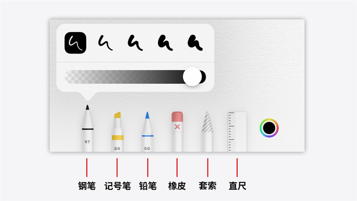 同样在虚拟键盘的功能栏中,轻点画笔按钮,可以看到有多种涂鸦工具,从左到右分别为钢笔、记号笔、铅笔、橡皮擦、套索、直尺、色盘,前三种为涂鸦笔的类型,代表着不同的显示质感,你也可以在选择了某一种涂鸦笔之后再次点击来选择笔划的粗细和透明度。