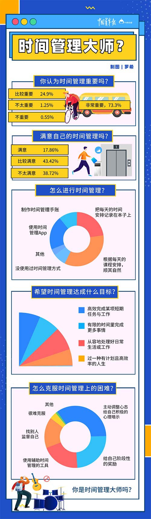 中青校媒调查显示,在被调查者中,17.86%对自己的时间管理满意,43.42%比较满意,但仍有38.72%对自己的时间管理不满意。