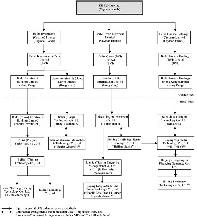 随着贝壳平台推出,公司于2018年7月在开曼群岛注册成立了开曼群岛贝壳控股有限公司(KE Holdings Inc.,“贝壳控股”)作为控股公司。从2018年7月至2019年6月,贝壳控股建立了一系列中间控股实体,这些实体直接或间接持有贝壳(天津)投资有限公司,金贝(天津)科技有限公司的股权。