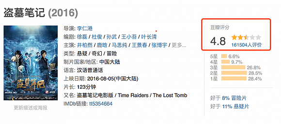 然而,这部电影仍旧上演了历史性的一幕:超10亿的票房成绩,然而,豆瓣4.8的低评分,这两个数据放在一起,令人啼笑皆非,甚至就连铁粉都生出了三叔不争气的感受。