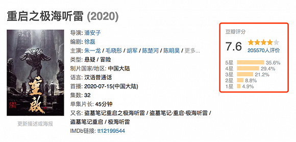 此外,这一部《重启之极海听雷》的改编成功,也印证了国内影视市场上,悬疑探险类题材开发,仍然具有巨大潜力。