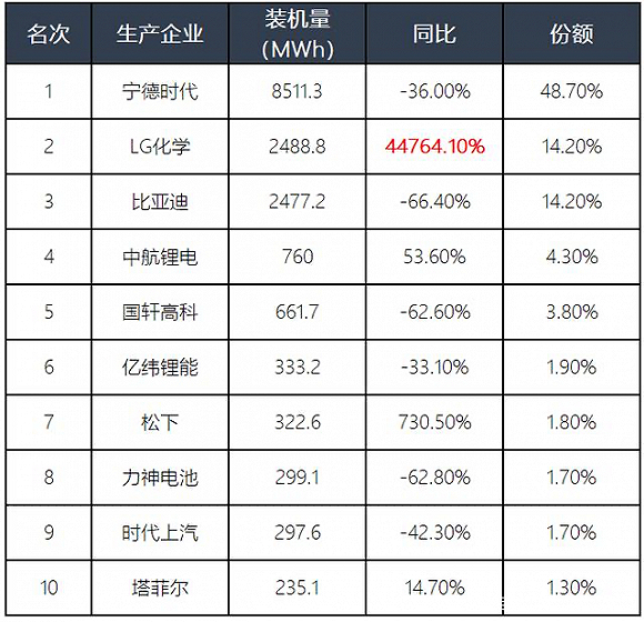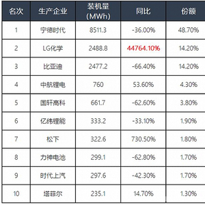 整体销量在下降,国内动力电池市场并不平静。伴随特斯拉国产后的销量剧增,合作电池企业LG化学、松下迅速跻身前列。LG化学更以装机量2488.8MWh、同比增幅达44764.1%的惊人数字改写了原有市场的格局。