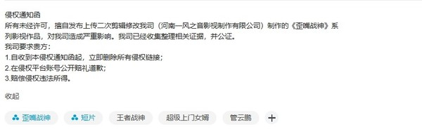 “歪嘴战神”制作方要求B站up主删除侵权视频 已发函