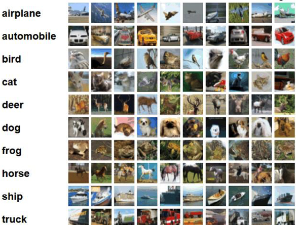 (标准的CIFAR-10分类) CIFAR-10 是一个包含60000张图片的数据集。其中每张照片为32*32的彩色照片,每个像素点包括RGB三个数值,数值范围 0 ~ 255。所有照片分属10个不同的类别,分别是 'airplane', 'automobile', 'bird', 'cat', 'deer', 'dog', 'frog', 'horse', 'ship', 'truck'其中五万张图片被划分为训练集,剩下的一万张图片属于测试集。
