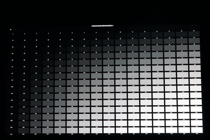 接下来是灰阶显示,在显示 256 级灰阶时,新款 iMac 从白到黑的表现十分细腻,层次感明显。