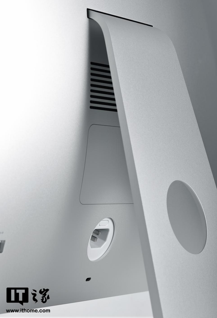 在电源接口上方还有扬声器开孔,只不过在视觉上被 iMac 的支架遮挡住了,正常的观看角度不太容易被发现。