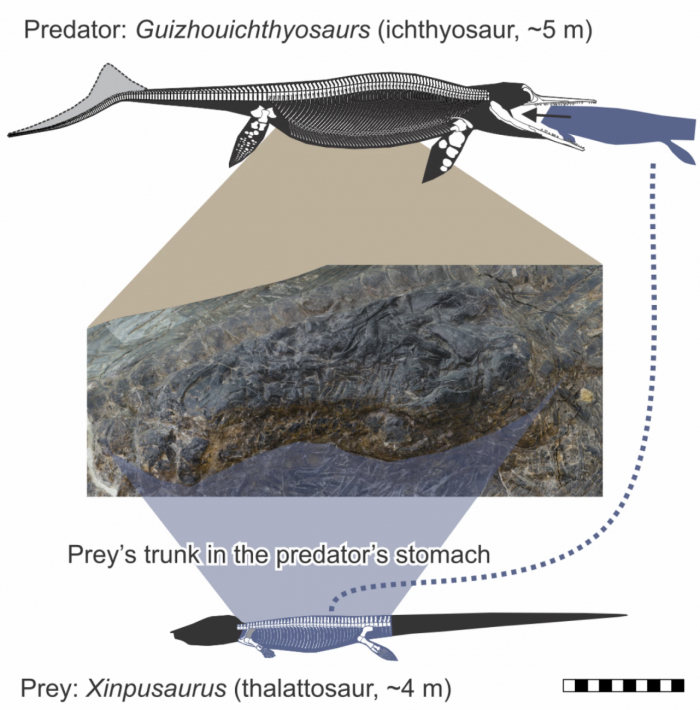 研究人员认为,捕食是更有可能造成远古残害的原因,而不是腐烂,因为通常最先腐烂并从身体上脱落的鱼龙四肢,却在大型爬行动物的肚子里被发现。此外,海洋食肉动物不可能吃掉被杀死的头和尾巴,而把营养丰富的躯干留在水中漂浮。这说明,是鱼龙撕开并吃掉了海龙。有可能是这只巨型爬行动物用咬合的力量咬断了4米长猎物的脊柱,然后再继续撕咬,其策略与现代虎鲸类似。