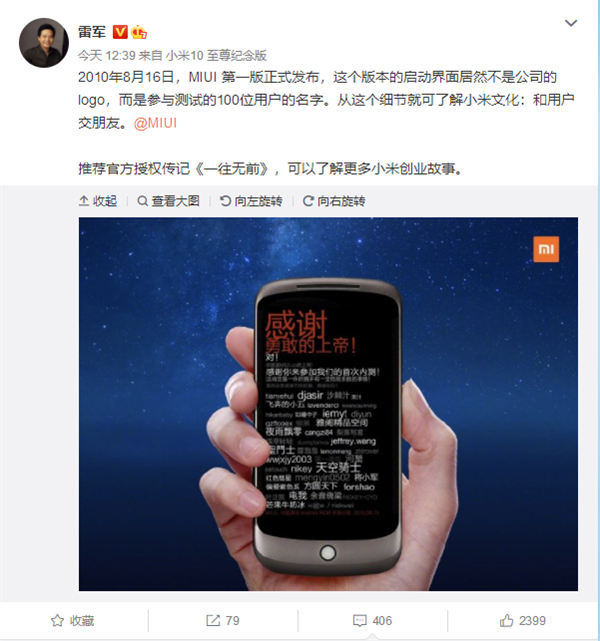 今天中午,雷军在个人微博晒出了小米历史上的一则趣事:2010年8月16日,MIUI第一版正式发布,这个版本的启动界面居然不是公司的Logo,而是参与测试的100位用户的名字。从这个细节就可了解小米文化:和用户交朋友。