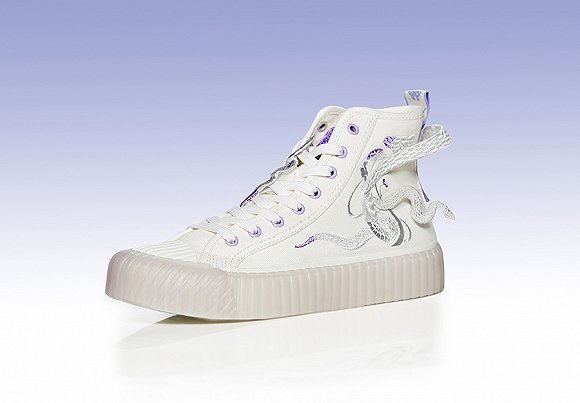 “白蛇款”以白色为主色调,鞋带穿孔和鞋舌等部分用紫色点缀,鞋身以刺绣的方式呈现白娘子和许仙背靠背的图案。鞋底采用半透明设计,配合整体清新特点。