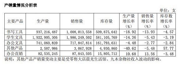 从晨光文具主要产品的产销量情况看,除了办公直销的生产量和销售量分别增长10.68%和13.56%外,书写工具、学生文具、办公文具和其他产品的生产量和销售量均出现了下跌,其中书写工具和学生文具的销量分别下降13.93%和5.43%。晨光文具解释称,其它产品的产销量变动主要是受零售大店晨光生活馆、九木杂物社收入波动的影响。
