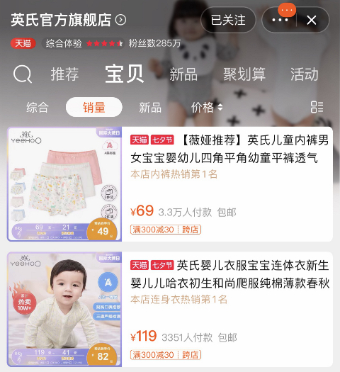 从知名度上来说,海澜之家于2017年收购的英式知名度最高,在2016年英式品牌曾获中国服装协会第四届“中国十大童装品牌”称号,定位中高端的英式在新手妈妈中认可度颇高,在淘宝官方旗舰店来看,其一款儿童平角裤单月销量达3.3万,宝宝连体衣的付款人数也有3351。