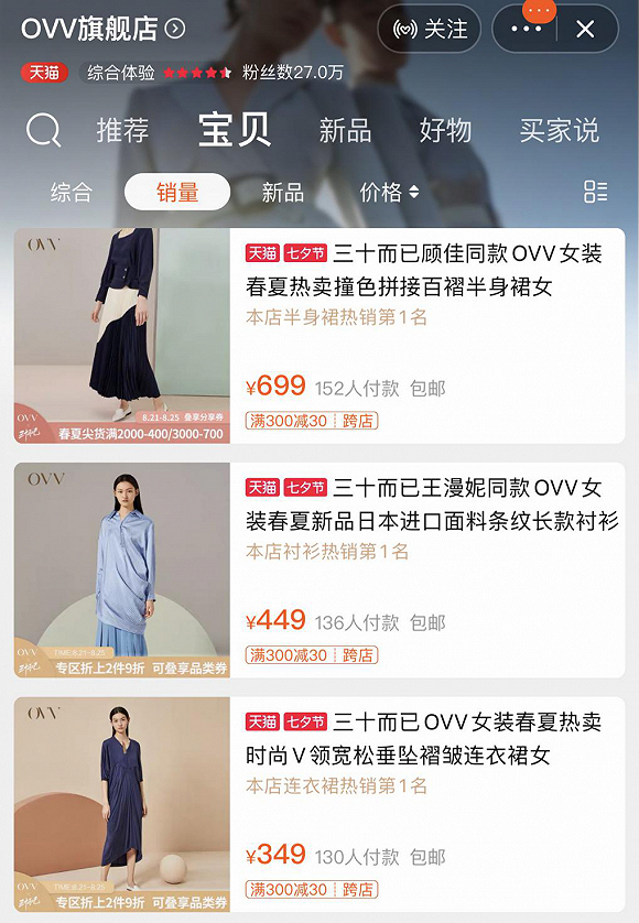 比如OVV女装,第一家旗舰店就开在南京最贵的商场——德基广场。今年还成为了热播剧《三十而已》的独家女装合作伙伴。但是,从销量上来看,爆款剧并没有带来爆款服装,这部剧的热度都贡献给了爱马仕。在百度指数搜索中,甚至找不到“OVV”或者“OVV女装的词条”,在其淘宝旗舰店上,截止到8月22日,明星同款的裙子衬衫销量排名前三的款式,在8月都还没有突破200件。