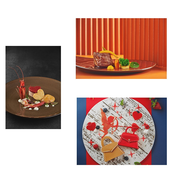 主菜鳕鱼柳配以甜椒、茴香、节瓜和藏红花柱头蛤蜊酱汁,鲜香美味,还有M2级KILLARA安格斯牛柳可供选择。牛柳用烟熏芝士玉米泥、胡萝卜和西兰花作点缀,还可以再配上一杯相得益彰的红酒。与此同时,还有与 GB-DAVID 品牌联名的精巧甜点。柚子草莓蛋糕、度思巧克力奶油和焦糖蛋糕搭配成丘比特与爱心的形状,为节日添彩。