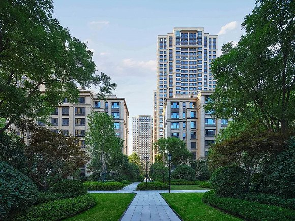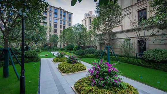 走在园区内采用300*1200mm长天然花岗岩石材铺贴而成的路面上,两侧种植高8米左右的行道树一路陪伴业主归家,配以红枫、紫薇、木槿、鸡爪槭、五角枫、蒙古栎、茶条槭等多种植被,郁郁葱葱,遮荫避雨,于阡陌错落间装点四季景色。同时,园区内的几方水景带来流动水域,独特的设计让目之所及,皆是生机。