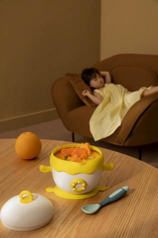 一些实用性极强的构造、细节设计也非常人性化。可以固定在桌上的稳定吸盘,宝宝自己吃拍不倒、打不翻、挪不动,家长再也不用对着满地狼藉的现场叹气了。碗口防烫隔热的可拆卸软质护套,为碗处于过热状态时提供一个触碰的缓冲带,避免宝宝碰到烫伤;护套边缘的小剐口设计意在让家长喂饭时更易刮除勺底残余食物,同时也方便宝宝自己喝汤。碗两边以天使翅膀为灵感设计的迷你把手,萌趣可爱,吸引孩子对用餐产生兴趣,同时锻炼孩子的抓握力,养成吃饭扶碗的用餐习惯。