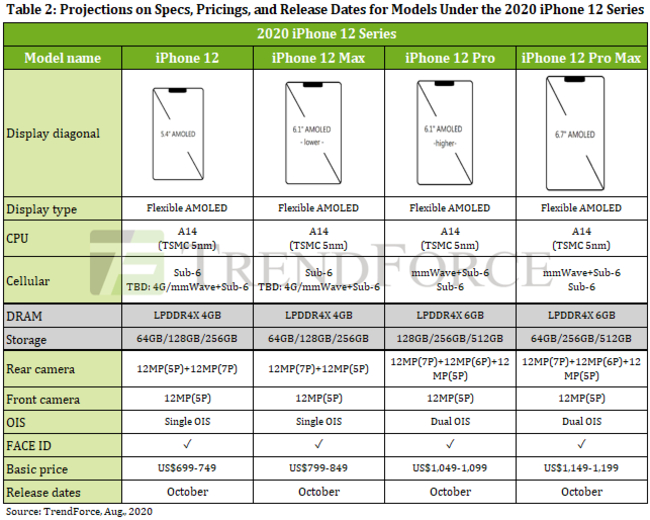 消费者可能最关心的就是售价方面。新款iPhone12系列基本和之前的售价持平,iPhone 12售价699美元至749美元起,Phone 12 Pro则是1049美元到1099美元之间。另外,还很有可能增加一个iPhone 12 Max机型。