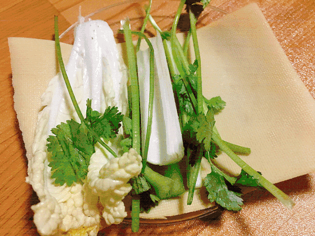 饭打包配鸡蛋酱,很郑重。大白菜叶子肥阔,要先用鸡蛋酱浸润一下,再盛住热米饭、土豆茄子泥,佐以葱段青白肆意,打包捧食。内里炙热,氤氲虽被包住,温度还是会透过青叶传到手心。