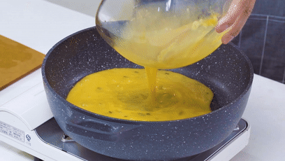 等温度慢慢升高,再咕嘟咕嘟冒泡,鸡蛋也会随着油跳动,这时气氛才算到了。用筷子快速搅吧!当大部分的油浸润在蛋絮里,就该下一步了。