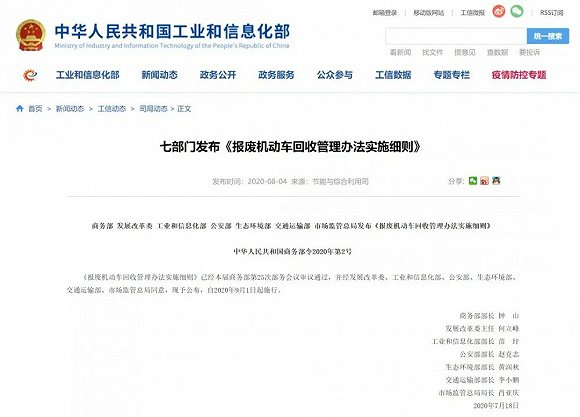 近日,商务部等7部门联合发布的《报废机动车回收管理办法实施细则》将于9月1日起施行。