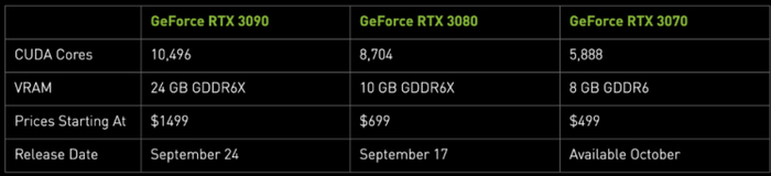 这款显卡更类似于 Titan 系列,比上一代「正常范围内」的最高级显卡 GeForce RTX 2080 Ti 的性能要强大许多。RTX 3090 将于 9 月 24 日上市,起始价为 1499 美元。如果说没有传说中 40G 显存的新泰坦,它就是旗舰 GPU 了。