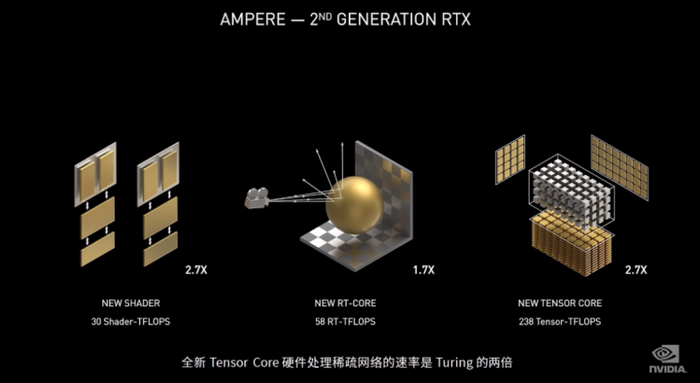 黄仁勋表示,GeForce RTX 30 系列显卡具备三项基础处理技术:30TFLOPS 算力的可编程着色器(Turing 架构是 11),双倍吞吐量,用于光追的 RT Core(58 RT TFLOPS,Turing 架构是 34),以及可自动忽略次要 DNN 权重的 Tensor Core(238Tensor TFLOPS,旧版为 89)。