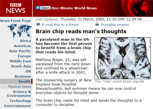 根据 2005 年 BBC 的报道,一位脖子以下全部瘫痪的美国青年, Matthew Nagle ,通过植入芯片成功学会用意念来完成简单的生活操作。
