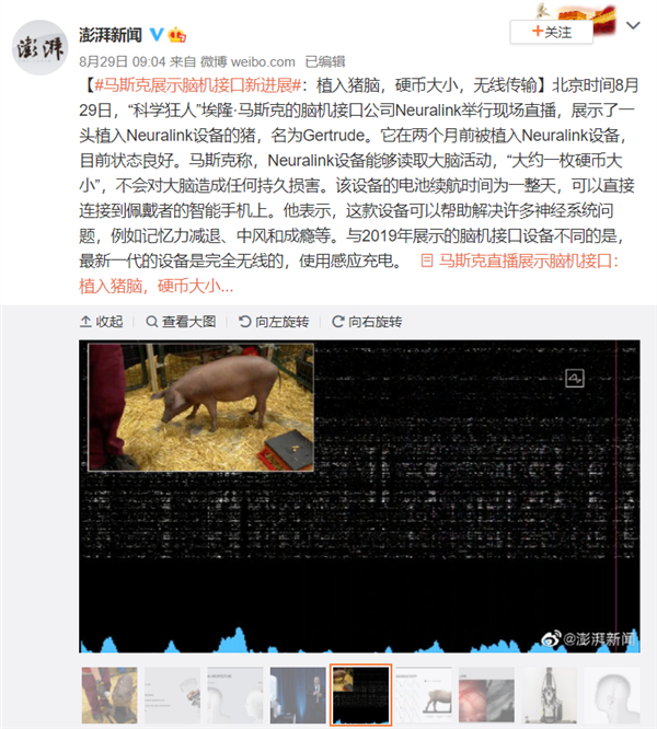马斯克用猪展示了旗下的脑机接口 Neuralink ,该设备仅硬币大小,植入猪脑后可以探测小猪神经元的活动,读取脑部活动。