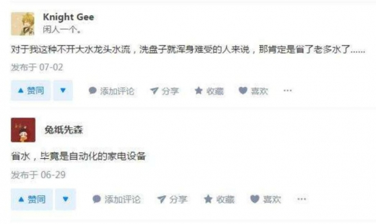 此外,还有网友“Knight Gee”表示,对于我这种不开大水龙头水流,洗盘子就浑身难受的人来说,那肯定是省了老多水了。“兔纸先森”则认为,洗碗机肯定是省水的,毕竟是自动化的家电设备。除此之外,还有网友表示用洗碗机刷碗,把经历花在陪家人或是自己感兴趣的事上不香吗?