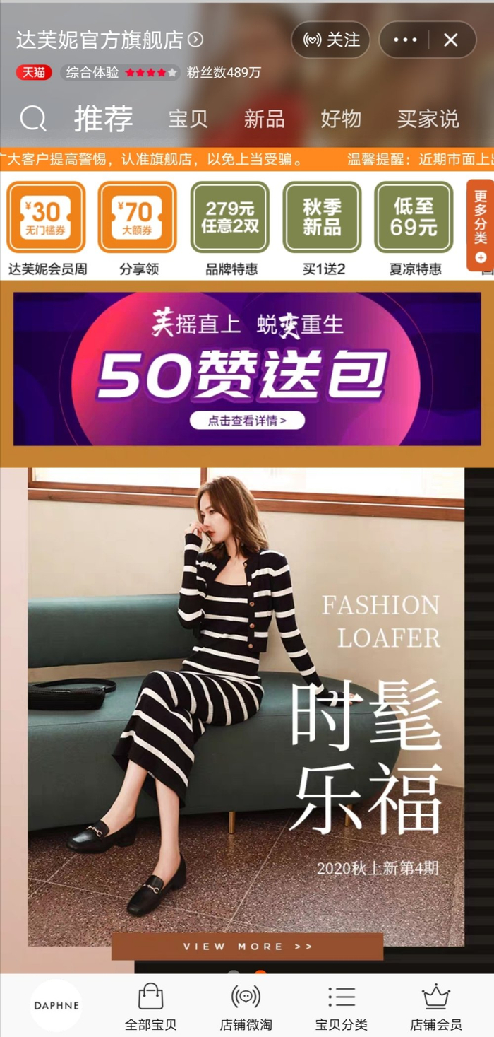 截至目前,达芙妮天猫旗舰店粉丝数量为489万,远远高于富贵鸟的37万,但跟百丽的913万仍有不小差距,而且粉丝数量的多少与实际销量并不能直接挂钩。