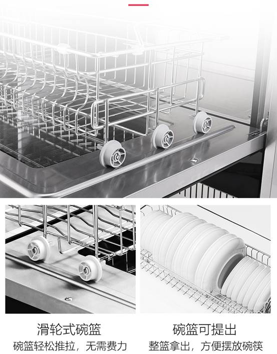 考虑到使用的便利性,佳歌一门式消毒柜,采用了滑轮式碗篮的贴心设计,即便碗篮满载时的重量,也能轻松推拉、无需费力。还能将整个碗篮直接提出,方便取放碗筷。