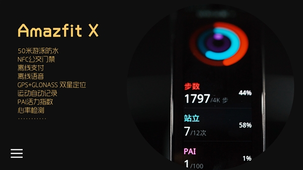 当然,除了健康监测和运动监测的核心功能以外,Amazfit X 也支持包括50米游泳防水、 NFC公交门禁,离线支付、离线语音等功能。