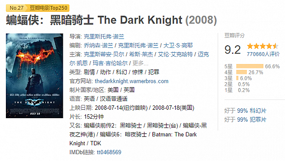 在那个互联网Web2.0时代,诺兰粉在IMDB评分网站上疯狂给《黑暗骑士》刷高分并给当时高居Top1的《教父》刷一星,蝙蝠侠最终在第一宝座上打了个盹。可毕竟只是水军一时兴起,刷分狂潮后,原本屈居《教父》之后的《肖申克的救赎》居然趁虚跃升到第一,渔翁得利。
