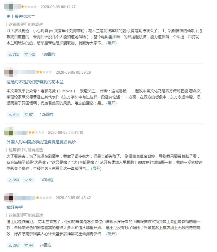 目前,豆瓣的热门短评已经充斥着对《花木兰》的不满。影片评价的大部分评价都为2星和3星,其中2星评价占34.2%,3星评价占34.6%。观众们比较满意的地方是饰演花木兰的演员刘亦菲的颜值,而除此以外,网友们对这部电影的其他部分好像都很有意见。