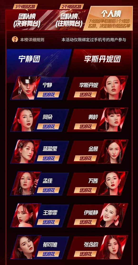 宁静是节目基础话题的来源之一,并在多次表演中担任队长;万茜、张雨绮从节目一开始就保持着高热度和话题度;孟佳的淘汰也曾引起不少网友的疑惑,同时唱跳水平也与女团适配;李斯丹妮在节目的中后半段发力、笔墨增多;鉴于遵循传统女团的基本盘,需要vocal、rap担当,李斯丹妮、郁可唯、黄龄也是合适的人选。