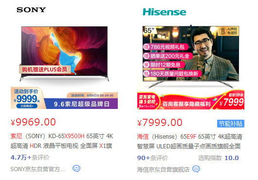 国产品牌这边海信65E9F是个不错的选择,画质方面可以和索尼9000系列一较高下,它不仅拥有100分区阵列背光,峰值亮度更是达到了1000nit,观看HDR视频时体验极佳。屏幕采用了量子点技术,色域非常广。