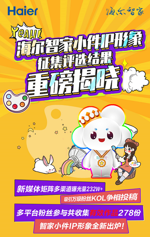 近日,海尔智能互联平台发起的“海尔智家小件IP形象征集”活动评选结果重榜揭晓, “智小兜”高中榜首。主打智家小场景解决方案的海尔智家小件突破次元壁,从此有了IP“品牌代言人”。此次征集活动在微博、小红书等新媒体渠道发起,吸引众多设计类、科技类KOL和KOC争相投稿,海尔粉丝踊跃参与,共计收集有效作品278件。最终“智小兜”凭借阳光、可爱、健康的形象,和智慧“基因”,一举“中标”,开启与用户深度沟通、深度链接的超级IP进阶之路。