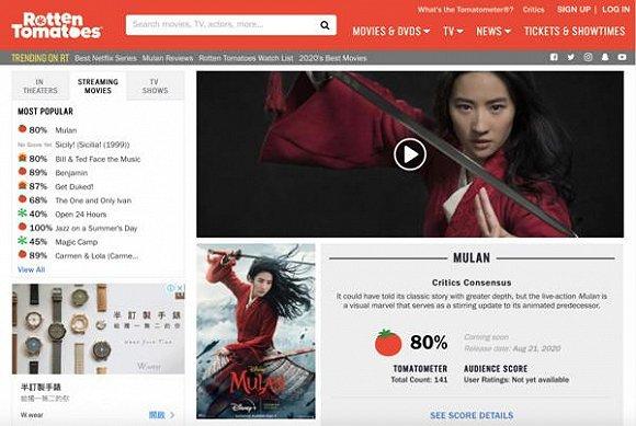 9月4日《花木兰》上线Disney+之后,海外口碑首先释出。烂番茄开分新鲜指数达到80%(现已下滑至77%、爆米花指数55%),这个开盘成绩与诺兰新片《信条》开盘分数相同,并且超过来了2019年上映的《阿拉丁》(开盘59%)、2015年席卷全球的《美女与野兽》(开盘74%)。Metacritic上42家媒体综合评分69分(现48家媒体68分、用户评分3.1分)。而如《旧金山纪事报》《Indiewire》《Variety》等给出了正面的评价。