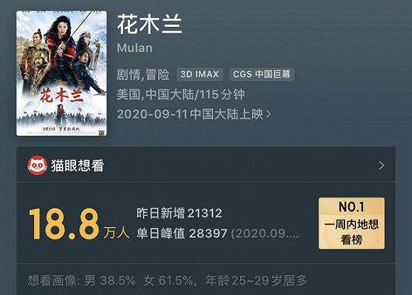 而《花木兰》这种命途多舛,让同样经历疫情的国内观众产生了一定的共情感,“这部电影也不容易”,至今《花木看》猫眼想看人数达到18.8万,登顶猫眼一周内地想看榜榜首,热度在同期电影中最高。