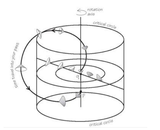 有引力存在时,根据爱因斯坦的相对论,时空不再平坦,这时光锥的结构会有扭曲变形,过去与未来的区别也会变得复杂。比如在哥德尔时空中,光锥会被时空旋转慢慢倾斜,最后倒转过来,这时的世界线可以是一条闭合的类时曲线——也就是说,哥德尔时空中存在可以回到过去的人。