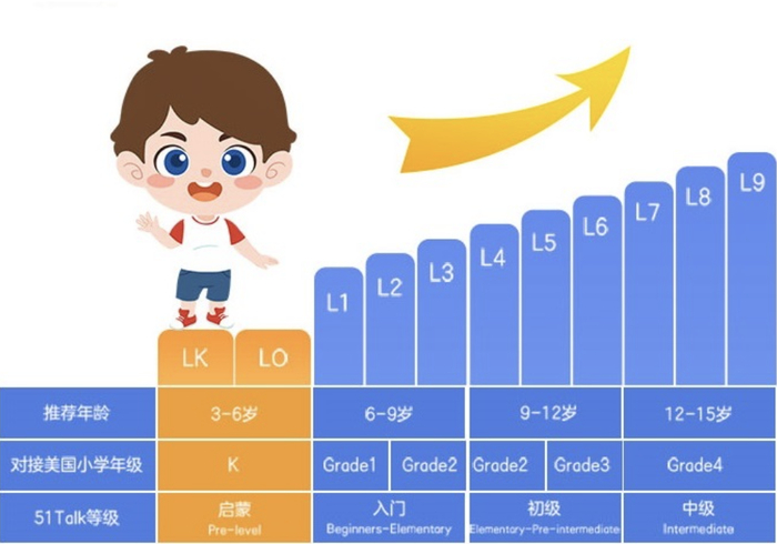 幼儿启蒙英语课程(公测版)的研发上线,也标志着51Talk的课程体系更加完善,至此,51Talk课程共分为4个阶段,11个级别,做到了对启蒙、入门、初级和中级阶段英语学习者的全面覆盖。
