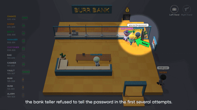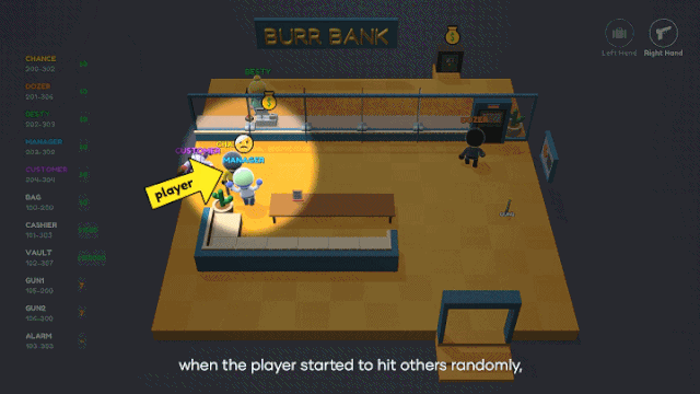 银行里有三个角色:茹茹、经理、顾客。游戏开发团队没有提前准备任何关于人物或剧情的脚本,仅仅设定了场景、人物和物理规则。比如银行柜员茹茹,是第一天来上班,其实很不老练;比如顾客其实是个投机的人,虽然他也没经历过什么激烈的大场面,但是他就是那种会想办法占一点便宜的人……