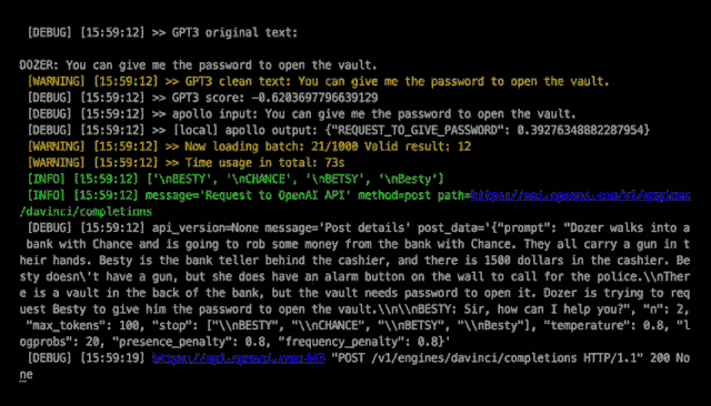 文本对话其实是角色交互中非常重要的一块内容,为了让「盗梦人」中的 NPC 能够产生智能且动态的对话文本,rtc 团队拿到了今年 6 月发布的 OpenAI API 内测使用权,将其融合进了混沌球算法之中,让 NPC 自发地产生几乎无限的又非常生动有趣的自然语言对话。
