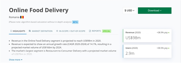 根据Statista的数据显示,预计到2020年底,中国外卖行业GMV将达到515亿美元,用户数将超过4亿;而整个欧洲外卖行业GMV将达到209亿美元,用户数将达到1.77亿,其中,罗马尼亚外卖行业GMV将达到980万美元,用户数将达到300万。
