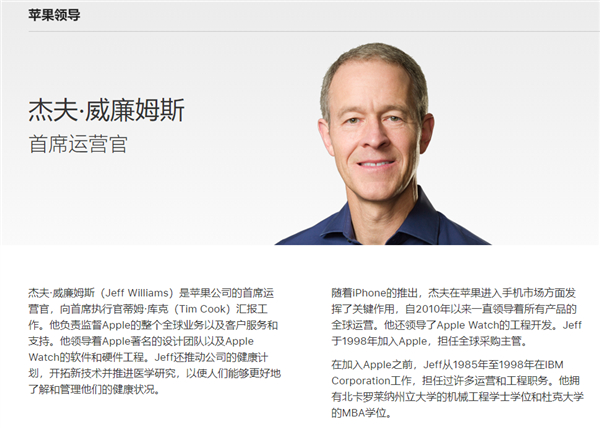 库克本身就是从COO职位成为CEO人选的,杰夫·威廉姆斯不仅职位经历相似,其风格也是同样的“低调、务实“,以致于被认为是”库克的库克“。